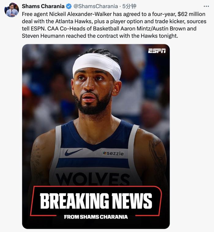北京时间7月1日,NBA自由交易市场窗口正式开启,据名记Shams报道,自由球员亚历山大-沃克将告别森林狼,他与老鹰将通过先签后换方式签订一份4年6200万美元的合同,森林狼获得一个27年来自骑士次轮和现金。